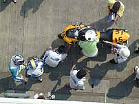 コ−スやマシンの状況を ライダ−同士で話している間に ピットクル−の手際の良い事。 「ヘアピンで宴会やってるから 気をつけてな〜、参加すんなよ」 |